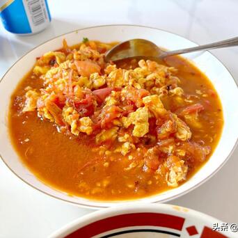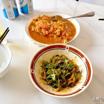 炒了个西红柿鸡蛋,拌米饭吃痛快又顺溜,拌了点香菜榨菜丝,辅助下饭,凉啤酒降温消汗![偷笑]🍻#夏天里的家常饭#